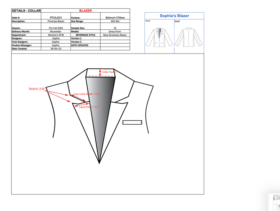 Technical package for a lightly structured blazer. Focuses on interior and packaging breakdown and grading for each size of the blazer.